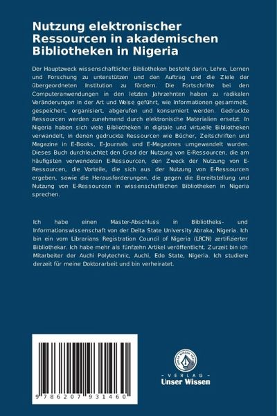Der Hauptzweck wissenschaftlicher Bibliotheken besteht darin, Lehre, Lernen und Forschung zu unterstützen und den Auftrag und die Ziele der übergeordneten Institution zu fördern. Die Fortschritte bei den Computeranwendungen in den letzten Jahrzehnten haben zu radikalen Veränderungen in der Art und Weise geführt, wie Informationen gesammelt, gespeichert, organisiert, abgerufen und konsumiert werden. Gedruckte Ressourcen werden zunehmend durch elektronische Materialien ersetzt. In Nigeria haben sich viele Bibliotheken in digitale und virtuelle Bibliotheken verwandelt, in denen gedruckte Ressourcen wie Bücher, Zeitschriften und Magazine in E-Books, E-Journals und E-Magazines umgewandelt wurden. Dieses Buch durchleuchtet den Grad der Nutzung von E-Ressourcen, die am häufigsten verwendeten E-Ressourcen, den Zweck der Nutzung von E-Ressourcen, die Vorteile, die sich aus der Nutzung von E-Ressourcen ergeben, sowie die Herausforderungen, die gegen die Bereitstellung und Nutzung von E-Ressourcen in wissenschaftlichen Bibliotheken in Nigeria sprechen.