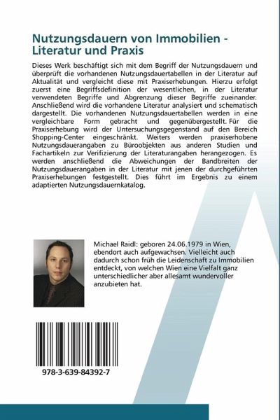 Dieses Werk beschäftigt sich mit dem Begriff der Nutzungsdauern und überprüft die vorhandenen Nutzungsdauertabellen in der Literatur auf Aktualität und vergleicht diese mit Praxiserhebungen. Hierzu erfolgt zuerst eine Begriffsdefinition der wesentlichen, in der Literatur verwendeten Begriffe und Abgrenzung dieser Begriffe zueinander. Anschließend wird die vorhandene Literatur analysiert und schematisch dargestellt. Die vorhandenen Nutzungsdauertabellen werden in eine vergleichbare Form gebracht und gegenübergestellt. Für die Praxiserhebung wird der Untersuchungsgegenstand auf den Bereich Shopping-Center eingeschränkt. Weiters werden praxiserhobene Nutzungsdauerangaben zu Büroobjekten aus anderen Studien und Fachartikeln zur Verifizierung der Literaturangaben herangezogen. Es werden anschließend die Abweichungen der Bandbreiten der Nutzungsdauerangaben in der Literatur mit jenen der durchgeführten Praxiserhebungen festgestellt. Dies führt im Ergebnis zu einem adaptierten Nutzungsdauernkatalog.