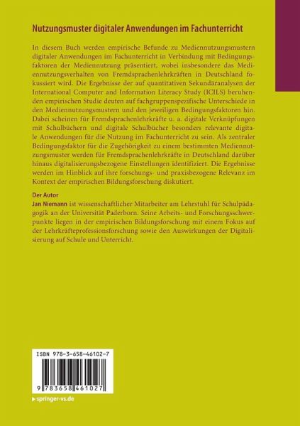 In diesem Buch werden empirische Befunde zu Mediennutzungsmustern digitaler Anwendungen im Fachunterricht in Verbindung mit Bedingungsfaktoren der Mediennutzung präsentiert, wobei insbesondere das Mediennutzungsverhalten von Fremdsprachenlehrkräften in Deutschland fokussiert wird. Die Ergebnisse der auf quantitativen Sekundäranalysen der International Computer and Information Literacy Study (ICILS) beruhenden empirischen Studie deuten auf fachgruppenspezifische Unterschiede in den Mediennutzungsmustern und den jeweiligen Bedingungsfaktoren hin. Dabei scheinen für Fremdsprachenlehrkräfte u.a. digitale Verknüpfungen mit Schulbüchern und digitale Schulbücher besonders relevante digitale Anwendungen für die Nutzung im Fachunterricht zu sein. Als zentraler Bedingungsfaktor für die Zugehörigkeit zu einem bestimmten Mediennutzungsmuster werden für Fremdsprachenlehrkräfte in Deutschland darüber hinaus digitalisierungsbezogene Einstellungen identifiziert. Die Ergebnisse werden im Hinblick auf ihre forschungs- und praxisbezogene Relevanz im Kontext der empirischen Bildungsforschung diskutiert.