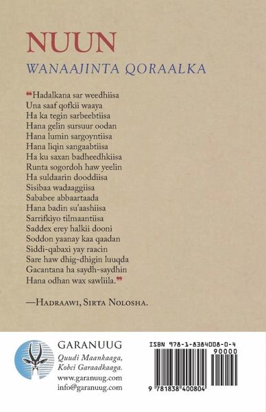 Nuun: Qalin iyo Qoraalkii. Wanaajinta Qoraalka. "Hadalkana sar weedhiisa Una saaf qofkii waaya Ha ka tegin sarbeebtiisa Hana gelin sursuur oodan Hana lumin sargoyntiisa Hana liqin sangaabtiisa Ha ku saxan badheedhkiisa Runta sogordoh haw yeelin Ha suldaarin dooddiisa Sisibaa wadaaggiisa Sababee abbaartaada Hana badin su'aashiisa Sarrifkiyo tilmaantiisa Saddex erey halkii dooni Soddon yaanay kaa qaadan Siddi-qabaxi yay raacin Sare haw dhig-dhigin luuqda Gacantana ha saydh-saydhin Hana odhan wax sawliila." -Hadraawi, Sirta Nolosha.