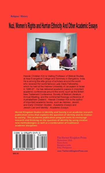 Nuzi, Women's Rights and Hurrian Ethnicity And Other Academic Essays is the first book in the Hermit Kingdom Studies in Identity and Society series. The academic research publication series seeks to examine the question of identity and its relation to society. The research publication project promotes creative new approaches to thinking about identity as well as a combination of traditional academic methodologies. Nuzi, Women's Rights and Hurrian Ethnicity And Other Academic Essays by Heerak Christian Kim is an excellent book that illustrates the scope and purpose of the new academic series. This book represents 15 years of active, professional academic research in correspondence with some of the greatest minds in the world in the field of Ancient Near Eastern Studies, History of Christianity, Old Testament Studies, New Testament Studies, Qumran Studies, and Medieval Studies. This book's concern with identity is reflected in studies such as the examination of the position of women in ancient Iraq, marriage in Qumran, and women's religious piety in the middle ages. Heerak Christian Kim has expertly achieved an interdisciplinary study of a great magnitude that is sure to be emulated by many others. Kim's erudition and writing is reminiscent of perhaps the greatest mind to have walked at Brandeis University - Professor Cyrus Gordon.