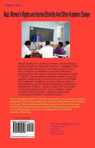 Nuzi, Women's Rights and Hurrian Ethnicity And Other Academic Essays is the first book in the Hermit Kingdom Studies in Identity and Society series. The academic research publication series seeks to examine the question of identity and its relation to society. The research publication project promotes creative new approaches to thinking about identity as well as a combination of traditional academic methodologies. Nuzi, Women's Rights and Hurrian Ethnicity And Other Academic Essays by Heerak Christian Kim is an excellent book that illustrates the scope and purpose of the new academic series. This book represents 15 years of active, professional academic research in correspondence with some of the greatest minds in the world in the field of Ancient Near Eastern Studies, History of Christianity, Old Testament Studies, New Testament Studies, Qumran Studies, and Medieval Studies. This book's concern with identity is reflected in studies such as the examination of the position of women in ancient Iraq, marriage in Qumran, and women's religious piety in the middle ages. Heerak Christian Kim has expertly achieved an interdisciplinary study of a great magnitude that is sure to be emulated by many others. Kim's erudition and writing is reminiscent of perhaps the greatest mind to have walked at Brandeis University - Professor Cyrus Gordon.