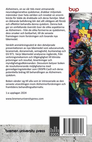 Alzheimers, en av vår tids mest utmanande neurodegenerativa sjukdomar, drabbar miljontals människor över hela världen och innebär en enorm börda för både de drabbade och deras familjer. Med en åldrande befolkning blir det allt viktigare att förstå och effektivt behandla denna sjukdom. Denna bok ger en omfattande översikt över de olika aspekterna av Alzheimers - från de olika formerna av sjukdomen, dess orsaker och botbarhet, till de senaste framstegen inom forskningen och lovande nya läkemedel. Särskilt anmärkningsvärd är den detaljerade presentationen av nya läkemedel som aducanumab, lecanemab, donanemab, semaglutid, buntanetap och GV-971. Varje läkemedel analyseras ingående, från verkningsmekanism och tillgänglighet till kliniska prövningar och resultat, biverkningar och myndighetsgodkännanden. Dessutom belyser boken de revolutionerande möjligheterna med genredigeringstekniker som CRISPR-Cas9 och deras potentiella bidrag till behandlingen av Alzheimers sjukdom. Boken vänder sig till alla som är intresserade av den senaste utvecklingen inom Alzheimerforskningen och framtidens behandlingsalternativ.