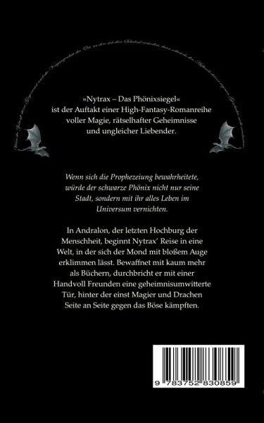 "Nytrax - Das Phönixsiegel" ist ein High-Fantasy-Roman voller Magie, rätselhafter Geheimnisse und ungleicher Liebender.Wenn sich die Prophezeiung bewahrheitete, würde der schwarze Phönix nicht nur seine Stadt, sondern mit ihr alles Leben im Universum vernichten.In Andralon, der letzten Hochburg der Menschheit, beginnt Nytrax' Reise in eine Welt, in der sich der Mond mit bloßem Auge erklimmen lässt. Bewaffnet mit kaum mehr als Büchern, durchbricht er mit einer Handvoll Freunden eine geheimnisumwitterte Tür, hinter der einst Magier und Drachen Seite an Seite gegen das Böse kämpften.
