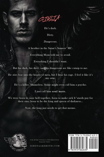 GIULIA He's dark. Dirty. Dangerous. A brother in my dad's MC. Everything Mom told me to avoid. Everything I shouldn't want. But his dark, his dirty, and his dangerous are like catnip to me. He stirs fear into the hearts of men, but I hear his rage. I feel it like it's my own. He's a killer. Shameless. Some might even call him a psycho. I just call him soul mate. We were born to raise hell together, born to make sick b*stards pay for their sins, born to be the king and queen of darkness... Now, the king just needs to get that memo. NYX is the first book in the eleven-book 'A Dark & Dirty Sinners' MC' series.