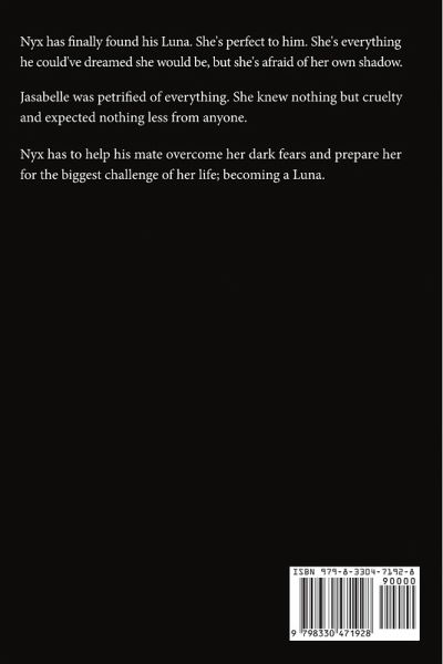 Nyx has finally found his Luna. She's perfect to him. She's everything he could've dreamed she would be, but she's afraid of her own shadow. Jasabelle was petrified of everything. She knew nothing but cruelty and expected nothing less from anyone. Nyx has to help his mate overcome her dark fears and prepare her for the biggest challenge of her life; becoming a Luna.