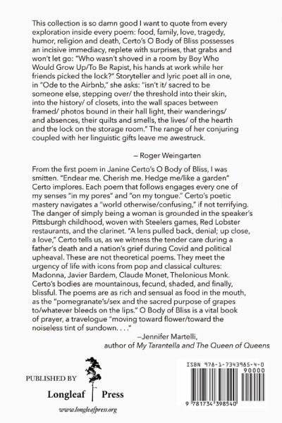 This collection is so damn good I want to quote from every exploration inside every poem: food, family, love, tragedy, humor, religion and death, Certo's O Body of Bliss possesses an incisive immediacy, replete with surprises, that grabs and won't let go: "Who wasn't shoved in a room by Boy Who Would Grow Up/To Be Rapist, his hands at work while her friends picked the lock?" Storyteller and lyric poet all in one, in "Ode to the Airbnb," she asks: "isn't it/ sacred to be someone else, stepping over/ the threshold into their skin, into the history/ of closets, into the wall spaces between framed/ photos bound in their hall light, their wanderings/ and absences, their quilts and smells, the lives/ of the hearth and the lock on the storage room." The range of her conjuring coupled with her linguistic gifts leave me awestruck. - Roger Weingarten
