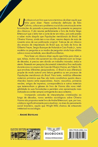 Um clássico é um livro que nunca terminou de dizer aquilo que tinha para dizer. Nesta conhecida definição de Ítalo Calvino, coloca-se o problema crucial da comunicação entre formulações do passado e preocupações do presente na pesquisa dos clássicos. E ela resume perfeitamente o livro de Andre Veiga Bittencourt que o leitor tem a sorte de ter em mãos, pois está prestes a saber muito daquilo que Populações meridionais do Brasil, de Oliveira Vianna, ainda tem a nos dizer, mesmo depois de mais de noventa anos de sua publicação original. Trata-se de um clássico dos ensaios de intepretação do Brasil que, ao lado de livros de Gilberto Freyre, Sergio Buarque de Holanda e Caio Prado Jr., tanto modelou as perguntas e os modos de perguntar ainda hoje válidos sobre a nossa sociedade, seus desafios e dilemas. Para fazer um clássico dizer aquilo que tinha para dizer, e que, talvez, muitos não quiseram (ou não puderam) ouvir ao longo de décadas, é preciso sem dúvida um trabalho inovador, árduo e atento. Baseado em pesquisa documental sistemática fina realizada durante anos no arquivo da Casa de Oliveira Vianna, em Niterói, RJ, que envolveu diferentes pesquisadores, O Brasil e suas diferenças propõe de modo autoral uma leitura genética ou em processo de Populações meridionais do Brasil. Para tanto, mobiliza diferentes materiais primários que lhes são tanto constitutivos quanto desconhecidos mesmo entre especialistas. Assim, rascunhos, primeiras versões, artigos de imprensa, correspondência e outros materiais que testemunham a gênese do livro de Vianna dão nova inteligibilidade às suas formulações e permitem uma aproximação mais matizada ao caráter sempre contingente dos seus contextos. Irrompendo camadas de interpretações cristalizadas ao longo de décadas, novos sentidos sociológicos sobre Oliveira Vianna são propostos neste livro de Andre Bittencourt, que, por isso, colabora significativamente para atualizar, na área do pensamento social brasileiro, aquilo que Wright Mills chamou de artesanato intelectual na sociologia. ¿ André Botelho