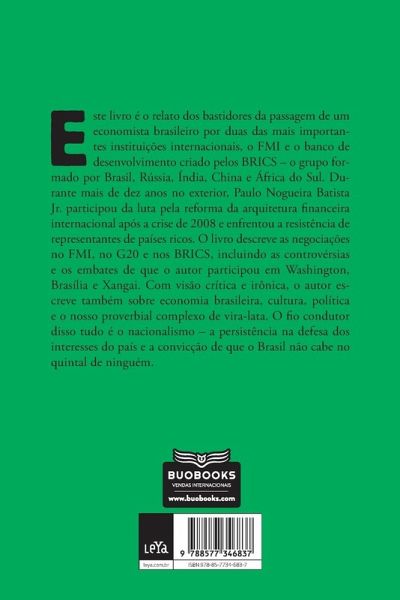 O Brasil não cabe no quintal de ninguém, de Paulo Nogueira Batista Jr., é o relato dos bastidores da passagem de um economista brasileiro por duas instituições internacionais, o FMI e o banco de desenvolvimento criado pelos BRICS ¿ o grupo de países emergentes. Durante mais de dez anos no exterior, ele participou da luta pela reforma da arquitetura financeira internacional após a crise de 2008 e enfrentou a resistência de representantes de nações ricas. Assim, com estilo leve, em que alterna humor e emoção, ironia e análise, narra embates entre países e mesmo dentro do governo brasileiro em temas como crises econômicas e a organização do sistema financeiro global, abordando ainda o nosso conhecido complexo de vira-lata. O que une essa grande variedade de assuntos é o Brasil, o nacionalismo e, segundo ele, ¿uma certa tendência a acreditar que nosso país tem um valor muito especial ¿ ainda que nós, brasileiros, nem sempre estejamos à sua alturä.