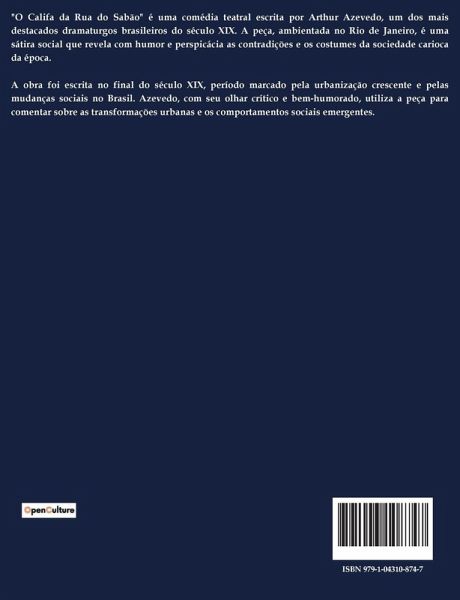 "O Califa da Rua do Sabão" é uma comédia teatral escrita por Arthur Azevedo, um dos mais destacados dramaturgos brasileiros do século XIX. A peça, ambientada no Rio de Janeiro, é uma sátira social que revela com humor e perspicácia as contradições e os costumes da sociedade carioca da época. A obra foi escrita no final do século XIX, período marcado pela urbanização crescente e pelas mudanças sociais no Brasil. Azevedo, com seu olhar crítico e bem-humorado, utiliza a peça para comentar sobre as transformações urbanas e os comportamentos sociais emergentes.