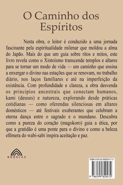 O Caminho dos EspíritosXintoísmo: do Ser ao SagradoHaruki Nishimura Nesta obra, o leitor é conduzido a uma jornada fascinante pela espiritualidade milenar que moldou a alma do Japão. Mais do que um guia sobre ritos e mitos, este livro revela como o Xintoísmo transcende templos e altares para se tornar um modo de vida - um caminho que ensina a enxergar o divino nas estações que se renovam, no trabalho diário, nos laços familiares e até na imperfeição da existência. Com profundidade e clareza, a obra desvenda os princípios ancestrais que conectam humanos, kami (deuses) e natureza, explorando desde práticas cotidianas - como oferendas silenciosas em altares domésticos - até festivais exuberantes que celebram a eterna dança entre o sagrado e o mundano. Descubra como a pureza do coração (magokoro) guia a ética, por que a gratidão é uma ponte para o divino e como a beleza efêmera do wabi-sabi inspira aceitação e paz. Palvras Chave: Xintoísmo espiritualidade japonesa; Cultura japonesa ancestral; Práticas espirituais japonesas; Filosofia ancestral japonesa; Rituais xintoístas tradicionais; Kami divindades japonesas; Espiritualidade natureza Japão; Torii portão sagrado; Shinto religião Japão; Harmonia espiritual japonesa;