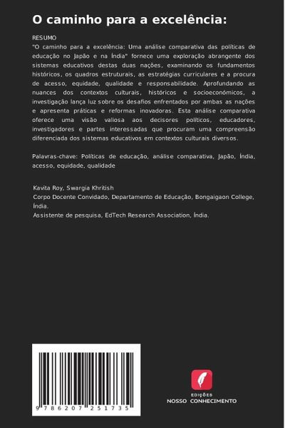 RESUMO"O caminho para a excelência: Uma análise comparativa das políticas de educação no Japão e na Índia" fornece uma exploração abrangente dos sistemas educativos destas duas nações, examinando os fundamentos históricos, os quadros estruturais, as estratégias curriculares e a procura de acesso, equidade, qualidade e responsabilidade. Aprofundando as nuances dos contextos culturais, históricos e socioeconómicos, a investigação lança luz sobre os desafios enfrentados por ambas as nações e apresenta práticas e reformas inovadoras. Esta análise comparativa oferece uma visão valiosa aos decisores políticos, educadores, investigadores e partes interessadas que procuram uma compreensão diferenciada dos sistemas educativos em contextos culturais diversos.Palavras-chave: Políticas de educação, análise comparativa, Japão, Índia, acesso, equidade, qualidade