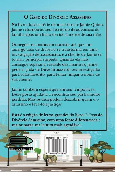 No livro dois da série de mistérios de Jamie Quinn, Jamie retornou ao seu escritório de advocacia de família após um hiato devido à morte de sua mãe. Os negócios continuam normais até que um amargo caso de divórcio se transforma em uma investigação de assassinato, e a cliente de Jamie se torna a principal suspeita. Quando ela não consegue separar a verdade das mentiras, Jamie pede a ajuda de Duke Broussard, seu investigador particular favorito, para tentar limpar o nome de sua cliente. Jamie também espera que em seu tempo livre, Duke possa ajudá-la a encontrar seu pai há muito perdido. Mas os dois podem descobrir quem é o assassino e levá-lo à justiça? Esta é a grande edição impressa de O Caso do Divórcio Assassino, com uma fonte / tipo de letra maior para facilitar a leitura.