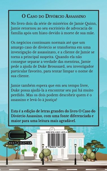 No livro dois da série de mistérios de Jamie Quinn, Jamie retornou ao seu escritório de advocacia de família após um hiato devido à morte de sua mãe. Os negócios continuam normais até que um amargo caso de divórcio se transforma em uma investigação de assassinato, e a cliente de Jamie se torna a principal suspeita. Quando ela não consegue separar a verdade das mentiras, Jamie pede a ajuda de Duke Broussard, seu investigador particular favorito, para tentar limpar o nome de sua cliente. Jamie também espera que em seu tempo livre, Duke possa ajudá-la a encontrar seu pai há muito perdido. Mas os dois podem descobrir quem é o assassino e levá-lo à justiça? Esta é a grande edição impressa de O Caso do Divórcio Assassino, com uma fonte / tipo de letra maior para facilitar a leitura.