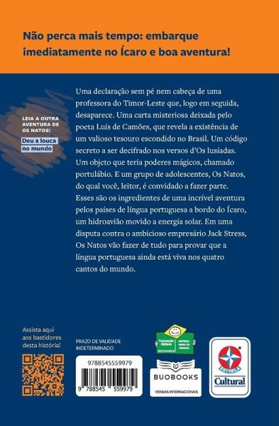 Uma declaração sem pé nem cabeça de uma professora do Timor-Leste que, logo em seguida, desaparece. Uma carta misteriosa deixada pelo poeta Luís de Camões, que revela a existência de um valioso tesouro escondido no Brasil. Um código secreto a ser decifrado nos versos de Os lusíadas. Um objeto que teria poderes mágicos, chamado portulábio. E um grupo de adolescentes, Os Natos, do qual o leitor é convidado a fazer parte. Esses são os ingredientes de uma incrível aventura pelos países de língua portuguesa a bordo do Ícaro, um hidroavião movido a energia solar. Em uma disputa contra o ambicioso empresário Jack Stress, Os Natos vão fazer de tudo para provar que a língua portuguesa ainda está viva nos quatro cantos do mundo. Envolto nessa aventura cheia de mistérios, o leitor interage com o livro para decifrar as pistas.
