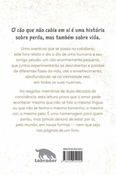 O cão que não cabia em si é uma história sobre perda, mas também sobre vida. Uma aventura que se passa no cotidiano, este livro relata o dia a dia de uma humana e seu amigo peludo, um cão enormemente pequeno, que juntos experimentarão as descobertas e paixões de diferentes fases da vida, até o envelhecimento, aprofundando-se na intimidade real, em todas as suas nuances. Ao resgatar memórias de duas décadas de convivência, esta leitura prova que o amor pode acontecer mesmo que não se fale a mesma língua ou que não se tenha o mesmo tamanho, a mesma cor, o mesmo pelo. É uma homenagem para quem partiu, mas jamais deixará de estar por aí, pelo mundo, em novas formas - nem que seja nas páginas de um livro.
