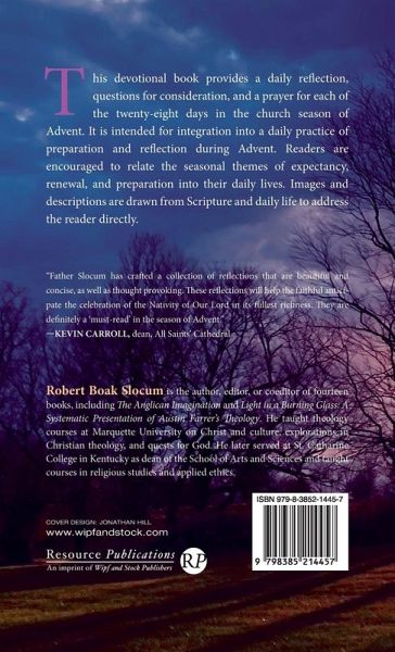 This devotional book provides a daily reflection, questions for consideration, and a prayer for each of the twenty-eight days in the church season of Advent. It is intended for integration into a daily practice of preparation and reflection during Advent. Readers are encouraged to relate the seasonal themes of expectancy, renewal, and preparation into their daily lives. Images and descriptions are drawn from Scripture and daily life to address the reader directly.
