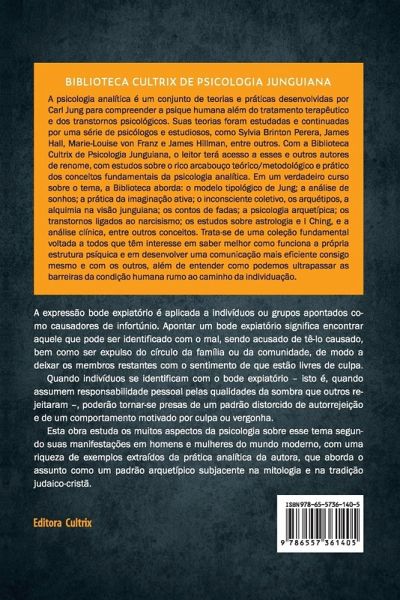 A expressão bode expiatório é aplicada a indivíduos ou grupos causadores de infortúnio, apontar um bode expiatório significa encontrar aquele que pode ser identificado com o mal. Quando os indivíduos se identificam com essa expressão ¿ e assumem a responsabilidade pessoal pelas qualidades da sombra que os outros rejeitaram ¿ poderão tornar-se presas de um padrão distorcido de autorrejeição e de um comportamento baseado na culpa e na vergonha. Esta obra estuda os muitos aspectos da psicologia sobre esse tema segundo suas manifestações em homens e mulheres do mundo moderno, com uma riqueza de exemplos extraídos da prática analítica da autora.