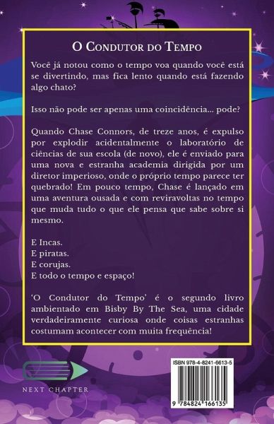 Você já notou como o tempo voa quando você está se divertindo, mas fica lento quando está fazendo algo chato? Isso não pode ser apenas uma coincidência... pode? Quando Chase Connors, de treze anos, é expulso por explodir acidentalmente o laboratório de ciências de sua escola (de novo), ele é enviado para uma nova e estranha academia dirigida por um diretor imperioso, onde o próprio tempo parece ter quebrado! Em pouco tempo, Chase é lançado em uma aventura ousada e com reviravoltas no tempo que muda tudo o que ele pensa que sabe sobre si mesmo. E Incas. E piratas. E corujas. E todo o tempo e espaço! 'O Condutor do Tempo' é o segundo livro ambientado em Bisby By The Sea, uma cidade verdadeiramente curiosa onde coisas estranhas costumam acontecer com muita frequência!