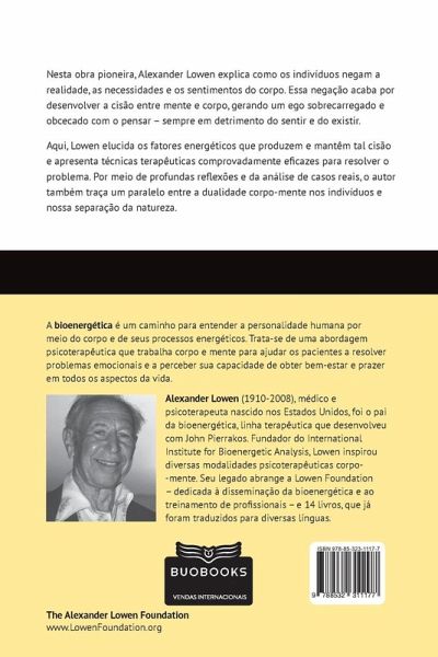 Nesta obra pioneira, Alexander Lowen explica como os indivíduos negam a realidade, as necessidades e os sentimentos do corpo. Essa negação acaba por desenvolver a cisão entre mente e corpo, gerando um ego sobrecarregado e obcecado com o pensar ¿ sempre em detrimento do sentir e do existir. Aqui, Lowen elucida os fatores energéticos que produzem e mantêm tal cisão e apresenta técnicas terapêuticas comprovadamente eficazes para resolver o problema. Por meio de profundas reflexões e da análise de casos reais, o autor também traça um paralelo entre a dualidade corpo-mente nos indivíduos e nossa separação da natureza.