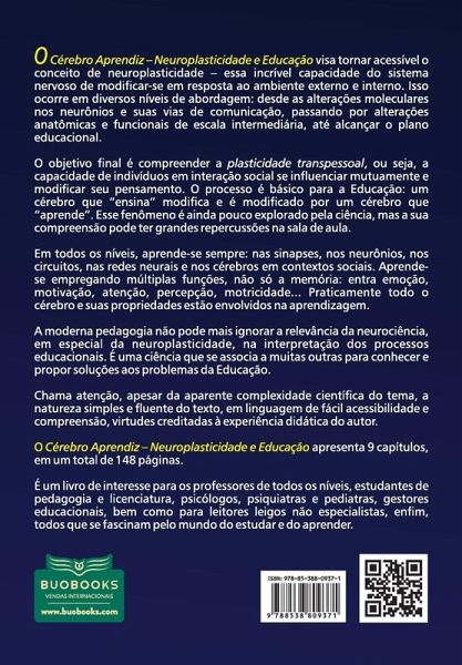 O Cérebro Aprendiz - Neuroplasticidade e Educação visa tornar acessível o conceito de neuroplasticidade - essa incrível capacidade do sistema nervoso de modificar-se em resposta ao ambiente externo e interno. Isso ocorre em diversos níveis de abordagem: desde as alterações moleculares nos neurônios e suas vias de comunicação, passando por alterações anatômicas e funcionais de escala intermediária, até alcançar o plano educacional. O objetivo final é compreender a plasticidade transpessoal, ou seja, a capacidade de indivíduos em interação social se influenciar mutuamente e modificar seu pensamento. O processo é básico para a Educação: um cérebro que "ensina" modifica e é modificado por um cérebro que "aprende". Esse fenômeno é ainda pouco explorado pela ciência, mas a sua compreensão pode ter grandes repercussões na sala de aula. Em todos os níveis, aprende-se sempre: nas sinapses, nos neurônios, nos circuitos, nas redes neurais e nos cérebros em contextos sociais. Aprende-se empregando múltiplas funções, não só a memória: entra emoção, motivação, atenção, percepção, motricidade... Praticamente todo o cérebro e suas propriedades estão envolvidos na aprendizagem. A moderna pedagogia não pode mais ignorar a relevância da neurociência, em especial da neuroplasticidade, na interpretação dos processos educacionais. É uma ciência que se associa a muitas outras para conhecer e propor soluções aos problemas da Educação. Chama atenção, apesar da aparente complexidade científica do tema, a natureza simples e fluente do texto, em linguagem de fácil acessibilidade e compreensão, virtudes creditadas à experiência didática do autor. O Cérebro Aprendiz - Neuroplasticidade e Educação apresenta 9 capítulos, em um total de 148 páginas. É um livro de interesse para os professores de todos os níveis, estudantes de pedagogia e licenciatura, psicólogos, psiquiatras e pediatras, gestores educacionais, bem como para leitores leigos não especialistas, enfim, todos que se fascinam pelo mundo do estudar e do aprender.
