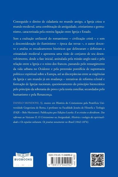 Conseguido o direito de cidadania no mundo antigo, a Igreja criou o mundo medieval, uma combinação de antiguidade, cristianismo e germanismo, caracterizada pela estreita ligação entre Igreja e Estado. Sem a exaltação unilateral do romantismo ¿ civilização cristã ¿ e sem a desconsideração do iluminismo ¿ época das trevas ¿, o autor descreve e analisa os encadeamentos históricos que delinearam e definiram a cristandade medieval e apresenta uma visão de conjunto de seu desenvolvimento, desde a fase inicial, assinalada pela missão anglo-saxã e pela relação entre a Igreja e o reino dos francos, passando pelo ressurgimento da vida urbana no Ocidente e pela pretensão pontifícia de supremacia política e espiritual sobre a Europa, até as discrepâncias entre as exigências da Igreja e um mundo já em mudança ¿ tentativas de reforma eclesial e formação de Igrejas nacionais, questionamento do princípio hierocrático pelo princípio da soberania do povo e pela teoria conciliar, secundados pelo humanismo e pela Renascença.