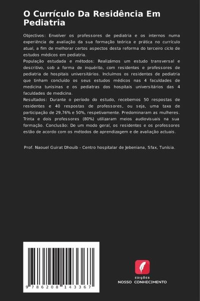 Objectivos: Envolver os professores de pediatria e os internos numa experiência de avaliação da sua formação teórica e prática no currículo atual, a fim de melhorar certos aspectos desta reforma do terceiro ciclo de estudos médicos em pediatria.População estudada e métodos: Realizámos um estudo transversal e descritivo, sob a forma de inquérito, com residentes e professores de pediatria de hospitais universitários. Incluímos os residentes de pediatria que tinham concluído os seus estudos médicos nas 4 faculdades de medicina tunisinas e os pediatras dos hospitais universitários das 4 faculdades de medicina.Resultados: Durante o período do estudo, recebemos 50 respostas de residentes e 40 respostas de professores, ou seja, uma taxa de participação de 29,76% e 50%, respetivamente. Predominaram as mulheres. Trinta e dois professores (80%) utilizaram meios audiovisuais na sua formação. Conclusão: De um modo geral, os residentes e os professores estão de acordo com os métodos de aprendizagem e de avaliação actuais.