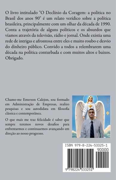 O livro intitulado "O Declínio da Coragem: a política no Brasil dos anos 90" é um relato verídico sobre a política brasileira, principalmente com um olhar da década de 1990. Conta a trajetória de alguns políticos e os absurdos que víamos através da televisão, rádio e jornal. Onde existia uma rede de intrigas e afrontosa entre eles e muito roubo e desvio do dinheiro público. Convido a todos a relembrarem uma década na política conturbada e com muitos altos e baixos. Obrigado.