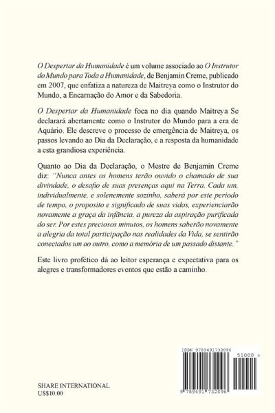 O Despertar da Humanidade é um volume associado ao O Instrutor do Mundo para Toda a Humanidade, de Benjamin Creme, publicado em 2007, que enfatiza a natureza de Maitreya como o Instrutor do Mundo, a Encarnação do Amor e da Sabedoria. O Despertar da Humanidade foca no dia quando Maitreya Se declarará abertamente como o Instrutor do Mundo para a era de Aquário. Ele descreve o processo de emergência de Maitreya, os passos levando ao Dia da Declaração, e a resposta da humanidade a esta grandiosa experiência. Quanto ao Dia da Declaração, o Mestre de Benjamin Creme diz: "Nunca antes os homens terão ouvido o chamado de sua divindade, o desafio de suas presenças aqui na Terra. Cada um, individualmente, e solenemente sozinho, saberá por este período de tempo, o proposito e significado de suas vidas, experienciarão novamente a graça da infância, a pureza da aspiração purificada do ser. Por estes preciosos minutos, os homens saberão novamente a alegria da total participação nas realidades da Vida, se sentirão conectados um ao outro, como a memória de um passado distante." Este livro profético dá ao leitor esperança e expectativa para os alegres e transformadores eventos que estão a caminho.