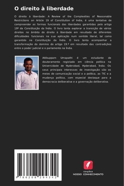 O direito à liberdade: A Review of the Complexities of Reasonable Restrictions on Article 19 of Constitution of India, é uma tentativa de compreender as formas funcionais das liberdades garantidas pelo artigo 19º da Constituição da Índia. O livro tenta explorar a transição de vários direitos no âmbito do direito à liberdade em resultado de diferentes dificuldades funcionais na sua aplicação num sentido literal, tal como garantido na Constituição da Índia. O livro tenta acompanhar a transformação do domínio do artigo 19.º em resultado das contradições entre o poder judicial e o parlamento na Índia.