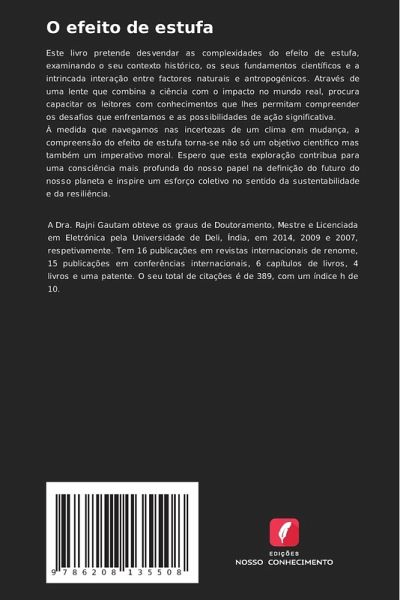 Este livro pretende desvendar as complexidades do efeito de estufa, examinando o seu contexto histórico, os seus fundamentos científicos e a intrincada interação entre factores naturais e antropogénicos. Através de uma lente que combina a ciência com o impacto no mundo real, procura capacitar os leitores com conhecimentos que lhes permitam compreender os desafios que enfrentamos e as possibilidades de ação significativa.À medida que navegamos nas incertezas de um clima em mudança, a compreensão do efeito de estufa torna-se não só um objetivo científico mas também um imperativo moral. Espero que esta exploração contribua para uma consciência mais profunda do nosso papel na definição do futuro do nosso planeta e inspire um esforço coletivo no sentido da sustentabilidade e da resiliência.
