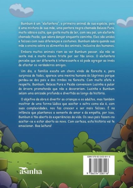 Bumbum é um "elefantera", o primeiro animal de sua espécie, pois é uma mistura de sua mãe, uma pantera negra chamada Beleza Pura, muito sábia e culta, que gosta muito de ler, com seu pai, um elefante chamado Pezão, que adora dançar enquanto caminha. Eles são unidos e felizes com suas diferenças e costumes. Bumbum adora quando sua mãe o ensina sobre os alimentos dos animais, inclusive dos humanos. Embora muitos animais riam ao ver Bumbum passar, ele não se sente mal e muito menos triste por ser tão único. O elefantera percebe que ser diferente é interessante e só pode agregar ao invés de afastar os verdadeiros amigos. Um dia, a família escuta um choro vindo da floresta e, para surpresa de todos, aparece uma menina humana às lágrimas porque perdeu-se dos pais e dos irmãos na floresta. Com muito afeto e respeito, Bumbum, Beleza Pura e Pezão convencem Luzinha a pular da árvore prometendo que não a devorariam. Luzinha e Bumbum selam uma amizade profunda e divertida ao longo da história. O objetivo da obra é divertir as crianças e os adultos, mas também mostrar de uma forma lúdica que aceitar o outro como ele é, com suas complexidades, nos faz crescer e ser mais felizes. É na infância que plantamos a semente do amor e da empatia, por isso, Bumbum é tão aberto às experiências da vida. Os seus pais fazem-no aceitar-se e estar aberto ao novo. Com certeza, esta história vai te emocionar. Boa leitura!