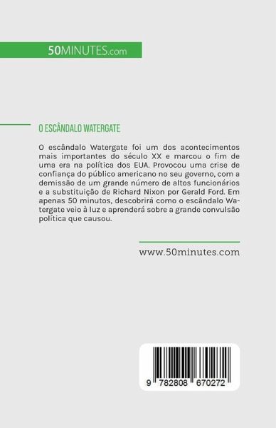 O escândalo Watergate foi um dos acontecimentos mais importantes do século XX e marcou o fim de uma era na política dos EUA. Provocou uma crise de confiança do público americano no seu governo, com a demissão de um grande número de altos funcionários e a substituição de Richard Nixon por Gerald Ford. Em apenas 50 minutos, descobrirá como o escândalo Watergate veio à luz e aprenderá sobre a grande convulsão política que causou. Este livro simples e informativo proporciona uma discussão aprofundada dos momentos-chave da controvérsia, incluindo as acções dos canalizadores da Casa Branca, o massacre de sábado à noite e a eventual demissão de Nixon. Inclui também biografias das principais pessoas envolvidas, uma introdução valiosa ao contexto político e social e uma avaliação do impacto do escândalo, dando-lhe toda a informação essencial sobre este evento controverso na política americana do século XX.