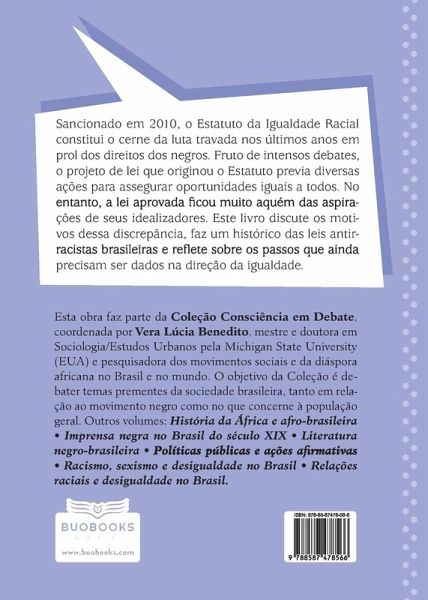 O Estatuto da Igualdade Racial reúne um conjunto de diretrizes para a igualdade de oportunidades e o combate à discriminação em virtude de raça/etnia. Além de abordar os dispositivos mais significativos do texto legal, esta obra analisa a importância do documento, os pontos que ficaram de fora quando de sua aprovação e as consequências desse marco fundamental para a igualdade racial no Brasil. Num momento em que nosso país depara com temas polêmicos, como o Estatuto da Igualdade Racial e as cotas em universidades, a Coleção Consciência em Debate pretende discutir assuntos prementes que interessam não somente aos movimentos negros como a todos os brasileiros. Fundamental para educadores, pesquisadores, militantes e estudantes de todos os níveis de ensino. Coordenação de Vera Lúcia Benedito.