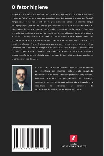 Porque é que é tão difícil executar iniciativas estratégicas? Porque é que é tão difícil chegar ao "feito"? As empresas que executam bem têm sucesso e prosperam. Porquê? Porque estão preparadas e condicionadas para o sucesso. Conseguem executar porque estão preparadas para isso. As pessoas que trabalham nestas empresas querem executar, são capazes de executar, esperam que a mudança aconteça regularmente e criaram um ambiente que minimiza o esforço necessário para que os objectivos sejam alcançados e maximiza a recompensa pelo seu esforço. Eles dominam o Fator Higiene. Este livro aborda de forma prática o que é este fator. São mais de 700 dicas práticas sobre como atingir um elevado nível de higiene para que a execução seja muito mais provável de acontecer com o mínimo de esforço e o máximo de sucesso. A higiene é discutida num contexto organizacional e pessoal para maximizar a eficácia de ambos. A eficácia pessoal transforma-se em eficácia organizacional. Os exemplos abordados provêm da experiência prática do autor.