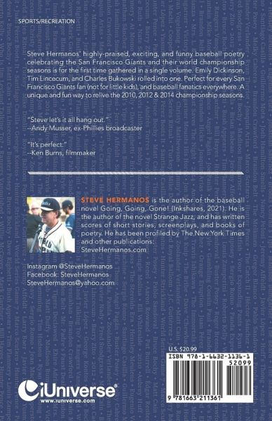 Steve Hermanos' highly-praised, exciting, and funny baseball poetry celebrating the San Francisco Giants and their world championship seasons is for the first time gathered in a single volume. Emily Dickinson, Tim Lincecum, and Charles Bukowski rolled into one. Perfect for every San Francisco Giants fan (not for little kids), and baseball fanatics everywhere. A unique and fun way to relive the 2010, 2012 & 2014 championship seasons. "Steve let's it all hang out." --Andy Musser, ex-Phillies broadcaster "It's perfect." --Ken Burns, filmmaker