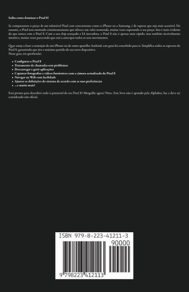 Saiba como dominar o Pixel 8! Se compararmos o preço de um telemóvel Pixel com concorrentes como o iPhone ou a Samsung, é de esperar que seja mais acessível. No entanto, o Pixel tem mostrado consistentemente que oferece um valor tremendo, muitas vezes superando o seu preço. Isto é mais evidente do que nunca com o Pixel 8. Com o seu chip avançado e IA inovadora, o Pixel 8 não é apenas mais rápido, mas também incrivelmente intuitivo, muitas vezes parecendo que está a antecipar todos os seus movimentos. Quer esteja a fazer a transição de um iPhone ou de outro aparelho Android, este guia foi concebido para si. Simplifica todos os aspectos do Pixel 8, garantindo que tira o máximo partido do seu novo dispositivo. Neste guia, irá aprofundar:Configurar o Pixel 8 Tratamento de chamadas sem problemas Descarregar e gerir aplicações Capturar fotografias e vídeos fantásticos com a câmara actualizada do Pixel 8 Navegar na Web com facilidade Ajustar as definições do sistema de acordo com as suas preferências ...e muito mais! Está pronto para descobrir todo o potencial do seu Pixel 8? Mergulhe agora! Nota: Este livro não é apoiado pela Alphabet, Inc e deve ser considerado não oficial.