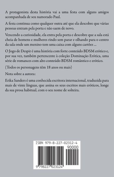 A protagonista desta história vai a uma festa com alguns amigos acompanhada de seu namorado Paul. A festa continua como qualquer outra até que ela descobre que várias pessoas entram pela porta e não saem de novo. Vencendo a curiosidade, ela entra pela porta e descobre que a sala está cheia de homens e mulheres rindo sem parar e olhando para o centro da sala onde um menino tem uma caixa com alguns cartões ... O Jogo de Despir é uma história com forte conteúdo BDSM erótico e, por sua vez, também pertencente à coleção Dominação Erótica, uma série de romances com alto conteúdo BDSM romântico e erótico. (Todos os personagens têm 18 anos ou mais) Nota sobre a autora: Erika Sanders é uma conhecida escritora internacional, traduzida para mais de vinte línguas, que assina os seus escritos mais eróticos, longe da sua prosa habitual, com o seu nome de solteira.