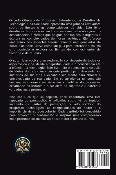 O Lado Obscuro do Progresso: Enfrentando os Desafios da Tecnologia e da Sociedade apresenta uma jornada reveladora sobre os limites e as complexidades da vida. Este livro desafia os leitores a expandirem suas mentes e abraçarem o desconhecido à medida que os guia por tópicos instigantes e explora as complexidades de nossa realidade. Ele oferece uma visão dos aspectos frequentemente negligenciados de nossa existência, serve como um guia para entender o trauma e o controle e explora os limites do conhecimento, da filosofia e da religião.O autor leva você a uma exploração convincente de todos os aspectos da vida, desde a espiritualidade e a consciência até a ciência e a tecnologia. Este livro não é apenas uma coleção de ideias abstratas, mas um guia prático para desvendar os mistérios de sua vida e expandir sua mente para abraçar a complexidade da realidade. Ele se aprofunda na condição humana, nas normas sociais e nas armadilhas do progresso, desafiando os leitores a olhar além da superfície e entender verdades mais profundas.Nos capítulos que se seguem, você encontrará uma rica tapeçaria de percepções e reflexões sobre vários tópicos, incluindo os limites da percepção, o lado sombrio do progresso tecnológico, as complexidades do poder e a importância da autodescoberta. Cada capítulo foi concebido para provocar o pensamento e inspirar uma compreensão mais profunda do mundo ao nosso redor e dentro de nós.Junte-se ao autor nesta jornada transformadora para expandir sua consciência, desafiar suas percepções e abraçar a complexidade da realidade. Quer esteja buscando crescimento pessoal, insight filosófico ou uma compreensão mais profunda do mundo, este livro oferece um guia abrangente para navegar pelas complexidades da vida e encontrar a paz interior.