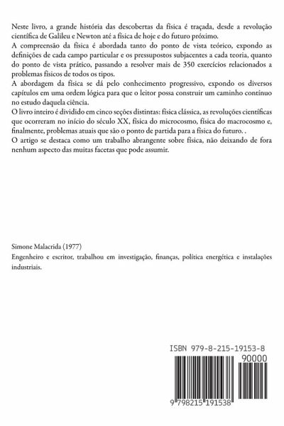 Neste livro, a grande história das descobertas da física é traçada, desde a revolução científica de Galileu e Newton até a física de hoje e do futuro próximo. A compreensão da física é abordada tanto do ponto de vista teórico, expondo as definições de cada campo particular e os pressupostos subjacentes a cada teoria, quanto do ponto de vista prático, passando a resolver mais de 350 exercícios relacionados a problemas físicos de todos os tipos. A abordagem da física se dá pelo conhecimento progressivo, expondo os diversos capítulos em uma ordem lógica para que o leitor possa construir um caminho contínuo no estudo daquela ciência. O livro inteiro é dividido em cinco seções distintas: física clássica, as revoluções científicas que ocorreram no início do século XX, física do microcosmo, física do macrocosmo e, finalmente, problemas atuais que são o ponto de partida para a física do futuro. . O artigo se destaca como um trabalho abrangente sobre física, não deixando de fora nenhum aspecto das muitas facetas que pode assumir.