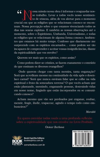 "¿Nossa missão nessa obra é informar e resguardar nosso trabalho. Levar a todos vocês nosso sentimento de tristeza, além de vos alertar para o momento crucial em que as religiões que se relacionam conosco se encontram. Nossa percepção sobre o que estamos vivenciando todos os dias nas searas espíritas. E também as nossas observações até o momento, sobre o Espiritismo, Umbanda, Universalismo, e todas as religiões que se relacionam de alguma forma conosco. Ambientes que estamos há muito tempo. Confesso que diariamente me surpreendo com os espíritos encarnados¿ como podem ser tão incapazes de compreender e aceitar vossas insignificâncias, diante da espiritualidade que vos envolve? Querem ser mais que os espíritos, como assim? Como podem dizer-se cristãos, se fazem exatamente o contrário do que ensinam os diversos evangelhos? Onde querem chegar com tanta mentira, tanta enganação? Será que acreditam mesmo na continuidade da vida após o desenlace carnal? Será que nunca ouviram falar que se colhe na vida espiritual o fruto da semeadura terrena? O que vocês acham que estão plantando, mentindo, enganando pessoas, destruindo vidas em nosso nome, fingindo que estão incorporados ou se comunicando conosco? Acham mesmo que vão ser perdoados por enganar, roubar, mentir, fingir, iludir, trapacear, agindo o tempo todo como embusteiros?¿ Marabô. Quero convidar todos vocês a uma profunda reflexão sobre a espiritualidade que nos envolve no Livro Proibido. Osmar Barbosa."