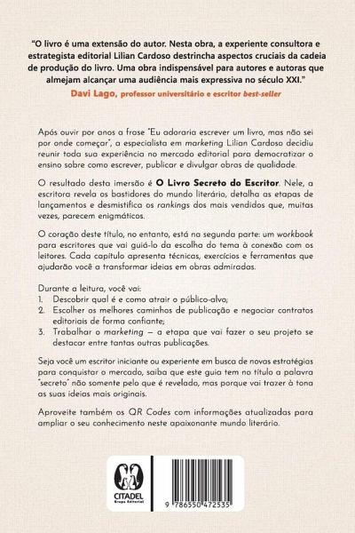 ¿Quando estava começando minha carreira há nove anos, Lilian me ajudou colocando meus livros em destaque na mídia, depois me ajudou com a publicação independente do meu primeiro New Adult.[...]¿ ¿ Babi A. Sette, escritora best-seller, reconhecida por publicar obras young adult e pioneira em romances de época no Brasil Após ouvir por anos a frase ¿Eu adoraria escrever um livro, mas não sei por onde começar¿, a especialista em marketing Lilian Cardoso decidiu reunir toda sua experiência no mercado editorial para democratizar o ensino sobre como escrever, publicar e divulgar obras de qualidade. O resultado desta imersão é O Livro Secreto do Escritor. Nele, a escritora revela os bastidores do mundo literário, detalha as etapas de lançamentos e desmistifica os rankings dos mais vendidos que, muitas vezes, parecem enigmáticos. O coração deste título, no entanto, está na segunda parte: um workbook para escritores que vai guiá-lo da escolha do tema à conexão com os leitores. Cada capítulo apresenta técnicas, exercícios e ferramentas que ajudarão você a transformar ideias em obras admiradas. Durante a leitura, você vai: Descobrir qual é e como atrair o público-alvo; Escolher os melhores caminhos de publicação e negociar contratos editoriais de forma confiante; Trabalhar o marketing ¿ a etapa que vai fazer o seu projeto se destacar entre tantas outras publicações. Seja você um escritor iniciante ou experiente em busca de novas estratégias para conquistar o mercado, saiba que este guia tem no título a palavra ¿secretö não somente pelo que é revelado, mas porque vai trazer à tona as suas ideias mais originais. Aproveite também os QR Codes com informações atualizadas para ampliar o seu conhecimento neste apaixonante mundo literário.