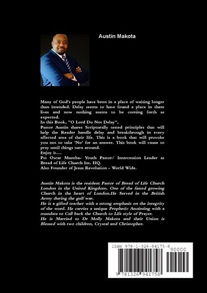 Many of God's people have been in a place of waiting longer than intended. Delay seems to have found a place in there lives and now nothing seems to be coming forth as expected. In this Book, "O Lord Do Not Delay", Pastor Austin shares Scripturally tested principles that will help the Reader handle delay and breakthrough in every affected area of their life. This is a book that will provoke you not to take 'No' for an answer. This book will cause to pray until things turn around. Enjoy it.... Pst Oscar Mumba- Youth Pastor/ Intercession Leader at Bread of Life Church Int. HQ. Also Founder of Jesus Revolution - World Wide.