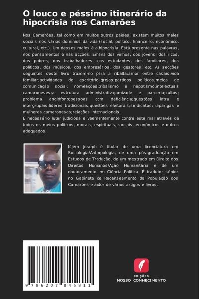 Nos Camarões, tal como em muitos outros países, existem muitos males sociais nos vários domínios da vida (social, político, financeiro, económico, cultural, etc.). Um desses males é a hipocrisia. Está presente nas palavras, nos pensamentos e nas acções. Emana dos velhos, dos jovens, dos ricos, dos pobres, dos trabalhadores, dos estudantes, dos familiares, dos políticos, dos músicos, dos empresários, dos gestores, etc. As secções seguintes deste livro trazem-no para a ribalta:amor entre casais;vida familiar;actividades de escritório;igrejas;partidos políticos;meios de comunicação social; nomeações;tribalismo e nepotismo;intelectuais camaroneses;a estrutura administrativa;amizade e parceria;cultos; problema anglófono;pessoas com deficiência;questões intra e intergrupais;líderes tradicionais;questões eleitorais;sindicatos; raparigas e mulheres camaronesas;relações internacionais.É necessário lutar judiciosa e veementemente contra este mal através de todos os meios políticos, morais, espirituais, sociais, económicos e outros adequados.