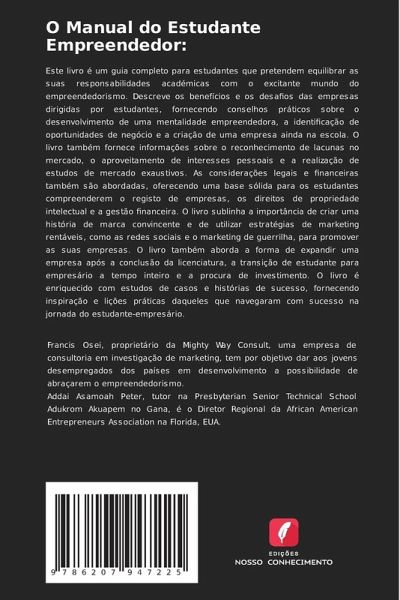 Este livro é um guia completo para estudantes que pretendem equilibrar as suas responsabilidades académicas com o excitante mundo do empreendedorismo. Descreve os benefícios e os desafios das empresas dirigidas por estudantes, fornecendo conselhos práticos sobre o desenvolvimento de uma mentalidade empreendedora, a identificação de oportunidades de negócio e a criação de uma empresa ainda na escola. O livro também fornece informações sobre o reconhecimento de lacunas no mercado, o aproveitamento de interesses pessoais e a realização de estudos de mercado exaustivos. As considerações legais e financeiras também são abordadas, oferecendo uma base sólida para os estudantes compreenderem o registo de empresas, os direitos de propriedade intelectual e a gestão financeira. O livro sublinha a importância de criar uma história de marca convincente e de utilizar estratégias de marketing rentáveis, como as redes sociais e o marketing de guerrilha, para promover as suas empresas. O livro também aborda a forma de expandir uma empresa após a conclusão da licenciatura, a transição de estudante para empresário a tempo inteiro e a procura de investimento. O livro é enriquecido com estudos de casos e histórias de sucesso, fornecendo inspiração e lições práticas daqueles que navegaram com sucesso na jornada do estudante-empresário.