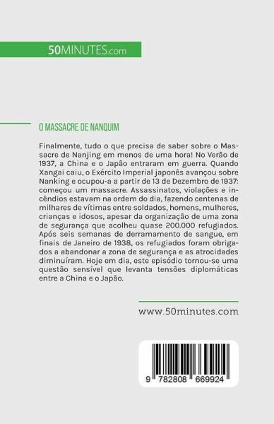 Finalmente, tudo o que precisa de saber sobre o Massacre de Nanjing em menos de uma hora! No Verão de 1937, a China e o Japão entraram em guerra. Quando Xangai caiu, o Exército Imperial japonês avançou sobre Nanking e ocupou-a a partir de 13 de Dezembro de 1937: começou um massacre. Assassinatos, violações e incêndios estavam na ordem do dia, fazendo centenas de milhares de vítimas entre soldados, homens, mulheres, crianças e idosos, apesar da organização de uma zona de segurança que acolheu quase 200.000 refugiados. Após seis semanas de derramamento de sangue, em finais de Janeiro de 1938, os refugiados foram obrigados a abandonar a zona de segurança e as atrocidades diminuíram. Hoje em dia, este episódio tornou-se uma questão sensível que levanta tensões diplomáticas entre a China e o Japão.