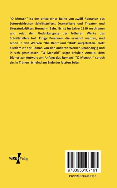 "O Mensch" ist der dritte einer Reihe von zwölf Romanen des österreichischen Schriftstellers, Dramatikers und Theater- und Literaturkritikers Hermann Bahr. Er ist im Jahre 1910 erschienen und setzt den Gedankengang der früheren Werke des Schriftstellers fort. Einige Personen, die erwähnt werden, sind schon in den Werken "Die Rahl" und "Drut" aufgetreten. Trotz alledem ist der Roman von den anderen Werken unabhängig und in sich geschlossen: "O Mensch!" sagte Fräulein Annalis, dem Diener zur Antwort am Anfang des Romans, "O Mensch!" sprach sie, in Tränen lächelnd am Ende der letzten Seite.