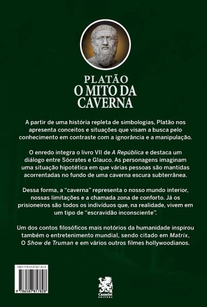 A partir de uma história repleta de simbologias, Platão nos apresenta conceitos e situações que visam a busca pelo conhecimento em contraste com a ignorância e a manipulação. O enredo integra o livro VII de A República e destaca um diálogo entre Sócrates e Glauco. As personagens imaginam uma situação hipotética em que várias pessoas são mantidas acorrentadas no fundo, de uma caverna escura subterrânea. Dessa forma, a "caverna" representa o nosso mundo interior, nossas limitações e a chamada zona de conforto. Já os prisioneiros são todos os indivíduos que, na realidade, vivem em um tipo de "escravidão inconsciente". Um dos contos filosóficos mais notórios da humanidade inspirou também o entretenimento mundial, citado em Matrix, Show de Truman e em vários outros filmes hollywoodianos".