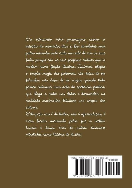 Da interacção entre personagens nasceu a criação do momento, dias a fio, simulados num palco ensaiado onde cada um sabe de cor as suas falas porque são os seus próprios sentires que se revelam numa ficção ilusória. Quimera, utopia o simples magia das palavras, não deixa de ser filosofia, não deixa de ser magia, quando tudo parece culminar num acto de existência poética, que chega a arder nos dedos e desencadeia na realidade movimentos telúricos nos corpos dos actores. Esta peça não é de teatro, não é representação, é mera ficção encarnada pelos que a vestem, homem e deusa, seres de outras dimensões retratados numa história de ilusões.