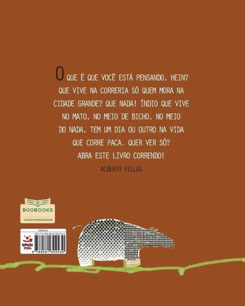 O QUE É QUE VOCÊ ESTÁ PENSANDO, HEIN? QUE VIVE NA CORRERIA SÓ QUEM MORA NA CIDADE GRANDE? QUE NADA! ÍNDIO QUE VIVE NO MATO, NO MEIO DE BICHO, NO MEIO DO NADA, TEM UM DIA OU OUTRO NA VIDA QUE CORRE PACA. QUER VER SÓ? ABRA ESTE LIVRO CORRENDO! ALBERTO VILLAS